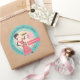 Femme à tarte rétro ou femme au foyer portant un tablier et portant une tourte fraîche sur cet autocollant pour un biz à tarte ou boulangerie, avec votre choix de couleurs et texte personnalisé.