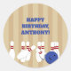 Ces autocollants sont parfaits pour les fêtes d'anniversaire de bowling. Ils présentent l'illustration d'une boule de bowling bleue avec des épingles blanches et rouges contre un arrière - plan de bowling bronzé. Votre message personnalisé apparaît en caractères bleus gras.