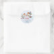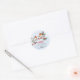 Branch with robin birds and berries Christmas holiday round sticker. This charming Christmas design showcases a fir branch with berries and redbreast robins on it. The background is of pale blue color. The phrase "Merry Christmas" combines script and decorative fonts. Personalize it with your own name.