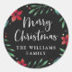 Cachez vos cadeaux de Noël ou vos mailings de saison avec ces stickers ronds festifs avec "Joyeux Noël" et votre nom de famille ou vos noms en lettres blanches sur un arrière - plan noir doux, entourés de fleurs poinsettia rouges et de feuillage botanique vert aquarelle.
