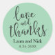 Un autocollant de remerciement personnalisé avec "amour et merci" dans le texte du script de brosse tendance. Ajoutez vos noms et la date du mariage ou tout autre texte de votre choix à la place de l'exemple de texte. La couleur arrière - plan verte de mer peut être changée en n'importe quelle autre couleur en utilisant l'option "customiser" et en choisissant la couleur arrière - plan désirée dans le sélecteur de couleurs. Cet autocollant est disponible en deux tailles. Choisissez la taille qui convient le mieux à votre projet.