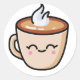 L'art présente une charmante tasse à café dessinée à la main avec un sourire délicieux. La tasse a des joues roses et des yeux fermés, lui donnant un contenu et une expression heureuse. Un tourbillon blanc fantaisiste sur le dessus du café représente de la vapeur ou du lait mousseux, ajoutant à l'ambiance cosy et joyeuse de l'illustration.