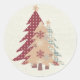 Ces autocollants rustiques de campagne ou enveloppes de phoques ont trois sapins de Noël ou de Fêtes aux couleurs bouchées de bordeaux, bronzés et plaid vert avec des flocons de neige et des pois sur deux des arbres qui ont également des étoiles d'or sur le dessus. L'arrière - plan est un tissage à l'allure de lin clair.