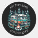 Voyage amusant camping thème autocollants personnalisés. Graphique rétro mignon d'un rv en couleurs vintages.