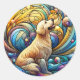 Un chien de repérage d'or se trouve au centre d'une conception complexe, entouré d'un tourbillon coloré de motifs cosmiques. Les courbes et les teintes vives des bleus, des violets et de l'or créent une atmosphère ludique mais surréaliste, comme si le chien était pris dans une danse céleste parmi les bulles et les vagues d'autres mondes.