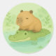Un capybara endormi qui chante sur un crocodile vert sympathique dans un étang calme et pastel. Cet autocollant doux de style dessin animé ajoute des vibes paisibles et décalées aux ordinateurs portables, carnets ou cadeaux pour les amoureux des animaux.