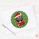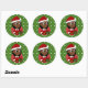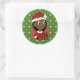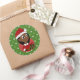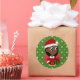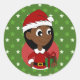 Conception avec l'illustration d'une fille afro-américaine mignonne et souriante avec de longs cheveux noirs, la fille porte un costume de Santa Clause avec casquette rouge et tenant un cadeau ; en cercle rouge sur arrière - plan vert avec motif sans couture avec étoiles vertes et blanches, Pour voir plus de mes personnages de dessin animé, s'il vous plaît visitez mon magasin