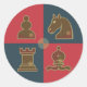 Autocollant rond avec design d'échecs avec chevalier, pion, rook et évêque sur arrière - plan bleu et rouge.