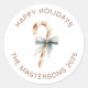 Autocollant rond représentant une illustration de candy cane à l'aquarelle mignonne entourée d'un message de fête et de votre propre nom et année personnalisés.