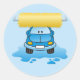 Caricature bleue souriante voiture laver sous pinceau de lavage de carrelage.
