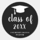 Un autocollant minimaliste de graduation avec un design simple et classique avec un grand casquette et "classe de l'année" dans une épaisse écriture manuscrite avec le nom du diplômé en blanc sur un arrière - plan noir. La couleur arrière - plan peut être changée en n'importe quelle couleur. Un style traditionnel avec une touche moderne, parfait pour une jeune diplômée. Ces autocollants sont excellents comme enveloppes scellées ou pour les faveurs de la fête.