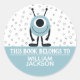 "Ce livre appartient à" autocollant avec un mignon monstre de dessin animé bleu pastel avec un grand oeil, un grand sourire, et des antennes noires.
