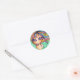 Un autocollant avec un crayon coloré illustration traditionnelle d'une fille aux grands yeux violets flottant sur un arrière - plan vert turquoise. Ses beaux cheveux longs coulent à droite et sont faits de brins bleus, roses, violets et jaunes qui donnent l'impression d'un arc-en-ciel. Autour d'elle, il y a des étoiles et des coeurs éparpillés.