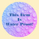 Sticker "This Item Is Water Proof" avec texte bleu gras et gouttes d'eau sur arrière - plan bleu et rose ou Personnalisez avec votre message et votre photo. Placer sur les colis, etc. Idéal pour toutes les grandes entreprises, grandes ou petites.