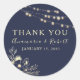 Elégant, rustique, boho, bleu marine mariage merci autocollant pour les faveurs avec dentelle dorée dorée fleurie, lumières à cordes et script de calligraphie moderne.