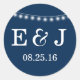 Mariage moderne String Lights Bleu collant rond avec des lumières à cordes blanches simples mais élégantes accrochées au sommet avec un mélange élégant de typographie moderne sur un arrière - plan bleu foncé nuit d'été. Un design simple et tendance, préppant, parfait pour l'été ! Cliquez sur le bouton "CUSTOMISER l'informatique" pour customiser les polices, déplacer le texte, changer la couleur arrière - plan et créer votre propre design unique d'autocollant mariage unique. Invitations assorties, affranchissement et autres fournitures mariages disponibles.