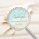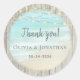 Cet autocollant de remerciement mariage présente une belle scène de plage bleu aqua des vagues de l'océan qui s'écrasent sur le rivage, accentué de lumières à cordes, encadré de bois flotté gris rustique.