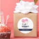 Bougie / stickers savon avec une adorable illustration graphique. Un chaton blanc avec une jolie image empreinte de patte sur sa fourrure. Dormir tranquillement. Un grand coeur rose derrière elle et quelques petites étoiles aussi.