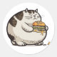 Un chat gros mangeant un autocollant hamburger présenterait probablement un dessin animé ou une image illustrée d'un chat avec un gros ventre rond consommant un hamburger. Le chat peut être montré assis debout, tenant le hamburger dans ses pattes, et sa bouche peut être ouverte large quand il prend une bouchée. Le hamburger peut avoir des garnitures comme la laitue, la tomate, le fromage, le ketchup ou la moutarde, et il peut y avoir de la graisse ou des miettes visibles sur le visage ou les pattes du chat. L'autocollant peut être conçu pour être utilisé sur des articles tels que des ordinateurs portables, des bouteilles d'eau ou des carnets.
