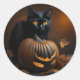 Chat noir et une tasse à café citrouille Halloween éffrayante face en bas.