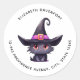 Adressez des autocollants avec une amusante illustration thématique Halloween pour les amoureux de les chats. Un gros chat noir aux yeux vêtu d'un grand casquette de sorcière noire avec une ceinture rose violet autour du bord.