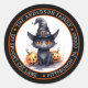Le plus mignon petit chat noir aquarelle arborant un casquette de sorcières et entouré de jack-o-lanterns circulaire adresse de retour design. Personnalisez simplement avec votre nom ou nom de famille et adresse de retour, ville, état et zip.