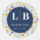 This wedding sticker features a charming circular navy blue design with the initials "L" and "B," surrounded by a vibrant floral pattern in shades of orange, purple, yellow, and green. The elegant serif typography spells out "THANK YOU" in a clean, formal style, creating a sophisticated yet approachable look. Perfect for expressing gratitude at your special event, this sticker combines a cheerful nature-inspired theme with a polished digital illustration technique, making it an ideal choice for any celebration.