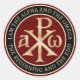 Icône Chi-ro christogramme avec lettres alpha et oméga. Monogramme formant abréviation pour le nom de Jésus-Christ. Couleur arrière - plan personnalisée. Deux champs de texte personnalisés sur cercle.