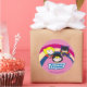 Regardez Chibi Supergirl, Chibi Wonder Woman et Chibi Batgirl devant un arc-en-ciel s'étendant d'un logo bleu de la Ligue de la Justice.