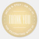 Ajoutez une touche élégante aux cartes de remerciement mariages et aux faveurs de réception avec autocollants ronds customisés / scellés d'enveloppe. Tout le libellé de ce modèle est simple à personnaliser pour une douche nuptiale, anniversaire, renouvellement de voeux ou autre occasion. Le texte d'un cercle peut être changé en nom et adresse pour faire des étiquettes d'adresse de retour arrondies modernes et chic. Le design minimaliste or et blanc présente un faux papier arrière - plan et une typographie classique de style art déco vintage. Veuillez noter que l'or est imprimé en couleur et non en papier métallique. Ces autocollants sont une façon élégante d'express de la gratitude aux amis et à la famille pour partager votre célébration spéciale de la journée. Félicitations à la mariée et au marié !