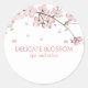 Élégant autocollant rond classique chic avec fleur de cerisier sur un arrière - plan blanc immaculé avec un joli texte rouge rose pour votre nom ou titre de société. Parfait pour l'image de marque d'entreprise, préférez les autocollants et les scellés d'enveloppe.