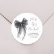 De jolis autocollants noirs et blancs pour vos invitations de douche de mariée, cartes de remerciement et faveurs de fête qui présentent une aquarelle élégante d'un délicat nœud coquette, "Elle va se marier" dans un script moderne, et le nom de la mariée et la date de la douche dans une lettre simple.