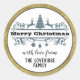 Chic et élégant jour férié Joyeux Noël classique collant rond avec une parties scintillant d'or scintille la bordure et l'arrière - plan blanc. Les mots "Joyeux Noël" sont écrits dans un script noir gras. L'autocollant est décoré avec un design gris tourbillonnant et soigné, avec un arbre de Noël, deux rennes et des billes. Au bas de l'autocollant se trouvent les mots "avec amour de" en gris, et votre nom de famille en noir.
