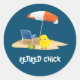 Chick à la retraite—Scène de plage. Parasol de plage, chaise et t-shirt de boisson tropicale. Design populaire.