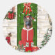 Chien berger allemand Noël assis à l'extérieur de la maison décorée avec la couronne de Noël, arbre de Noël est une idée cadeau de Noël parfait pour les amoureux de les chiens.