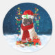 Sticker Rond Chien carlin en neige avec cadeaux de Noël