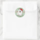 Un adorable chien de Poméranie blanc porte un casquette de Père Noël rouge devant des cordes de lumières rouges et blanches de Noël sur cet autocollant. Le texte vert personnalisé au-dessus et au-dessous de l'image dit actuellement "Joyeuses Fêtes", mais vous pouvez le modifier, si vous le souhaitez. L'image et le texte sont placés sur un arrière - plan vert clair. Parfait pour votre correspondance ou forfaits de Noël !