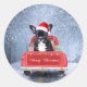 Sticker Rond Chien de taureau français en neige assis dans un c