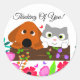 Sticker Rond Chien Et Chat Cute Avec Fleurs Et Papillon