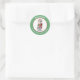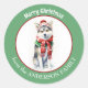 L'image d'un adorable chien Husky de Sibérie portant un écharpe d'hiver motif rouge et un casquette est au centre de cet autocollant de vacances. L'image est encadrée dans une bordure circulaire verte qui contient votre texte personnalisé en blanc. Idéal pour les cartes de Noël, la correspondance et les forfaits cadeaux.