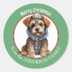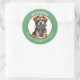 L'image d'un adorable petit chiot Schnauzer en miniature portant sa veste d'hiver et son casquette est au centre de cet autocollant de vacances. L'image est encadrée dans une bordure circulaire verte qui contient votre texte personnalisé en blanc. Idéal pour les cartes de Noël, la correspondance et les forfaits cadeaux.