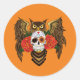 Un grand hibou brun à cornes avec jour du crâne de sucre mort et des roses rouges dans un fond d'orange