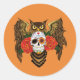 Un grand hibou à cornes avec un jour de crâne de sucre mort et des roses rouges dans un fond d'orange.