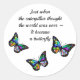 "Juste au moment où la chenille pensait que le monde était fini - Il est devenu un papillon", une citation inspirante. La beauté et l'émerveillement de la transition de chenille, cocon, papillon. Papillon citation classique collant rond - inspirant et encourageant.