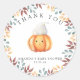 "Un petit citrouille est en route. Célébrez avec ce citrouille de dessins animés sur le thème du baby shower ! Aquarelle caricature kawaii citrouille avec casquette d'automne (casquette) et feuilles d'automne. Au verso de la carte se trouvent les feuilles d'automne.