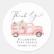 Un élégant autocollant de douche pour bébé fille avec "Merci" dans un script élégant avec un swash coeur, aquarelles d'un camion vintage rose, bouquets citrouille et floraux et le nom de la future mère et la date de douche dans la typographie élégante.