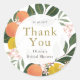 Scellez vos enveloppes d'invitation ou faveurs avec ces stickers classiques citrus merci. Avec son nom et sa date d'événement encadrés par une couronne d'aquarelle de verdure, d'oranges et de citrons. Coordonne avec la collection Citrus Love trouvée dans la boutique Adore Paper Co. Zazzle.