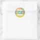 Classe de Graduation Retro Daisies de 2023 Stickers Classic Rond sont conçus avec des couleurs de bandes dorées orange, turquoise et jaune tendance. Le texte est personnalisable "Classe de 2023" en gras blanc en lettres courbes. Trois grandes fleurs marguerrières amusantes sont au-dessus des rayures. Le nom du diplômé est au centre inférieur. Cliquez sur l'option Personnaliser plus et entrez le nom.