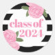 Un autocollant de graduation avec une illustration de roses roses avec le texte "Classe de 2024" en rose. L'Arrière - plan est motif à rayures noir et blanc.