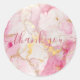 Éclairez votre emballage ou vos faveurs événementielles avec cet élégant autocollant rond avec un design en marbre rose et or éclatant. Le style manuscrit "merci" en écriture fluide ajoute une touche personnelle et élégante à l'arrière - plan d'aquarelle tourbillonnant. Parfait pour les mariages, les fêtes ou les commandes de boutique, cet autocollant apporte une pop de couleur et de gratitude à chaque cadeau ou enveloppe.